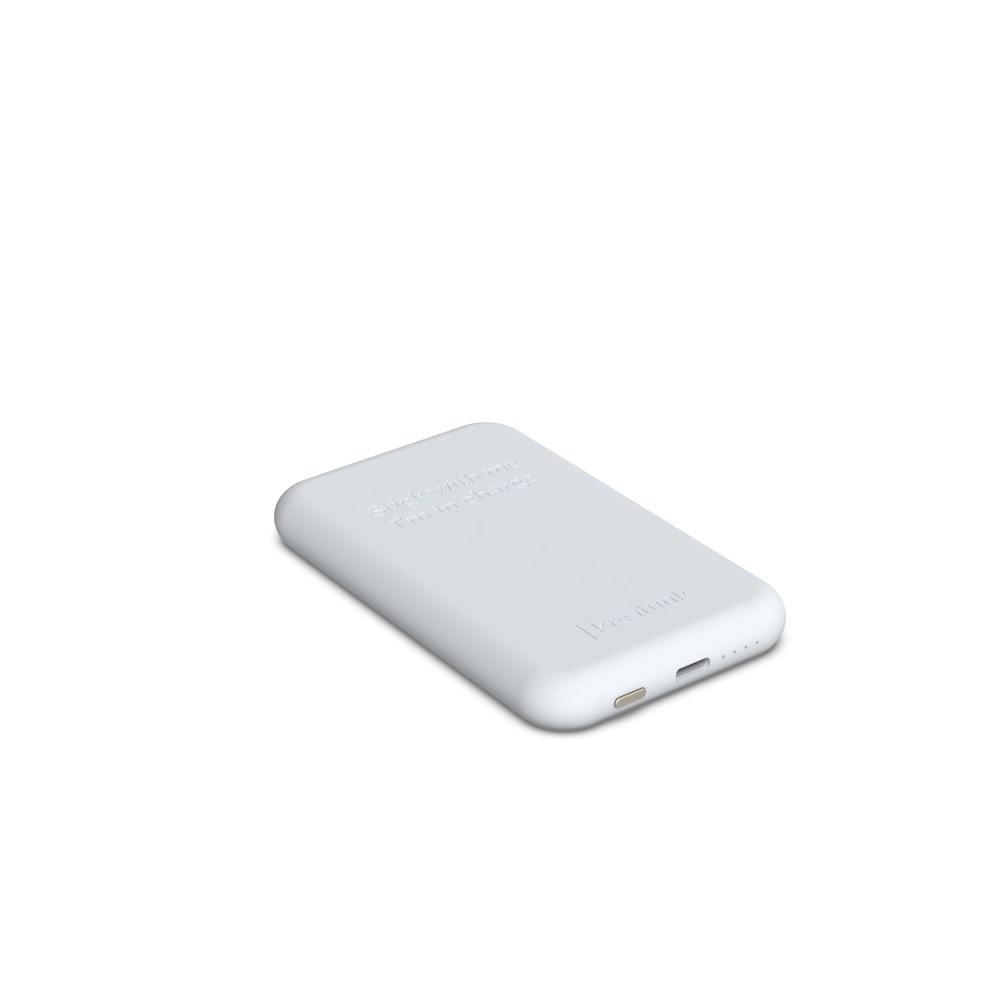 Powerbank Qi som sätts fast bak på mobilen via magnet. 5000 mAh MagSafe. Qi. USB-C input/output. Mått: L10,4 cm / B6,4 cm / H1,1 cm. Färg: Grå